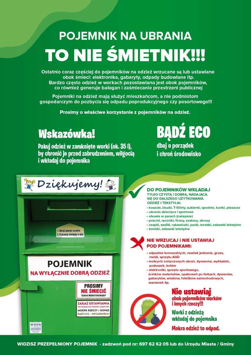 Odpady tekstyliów i odzieży należy deponować w oznaczonych pojemnikach ustawionych na terenie Gminy Miejskiej Kłodzko lub oddać do Punktu Selektywnej Zbiórki Odpadów Komunalnych (PSZOK), który znajduje się na ul. Sierpowej w Kłodzku.