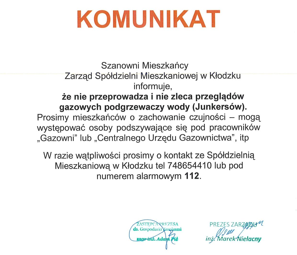 W przypadku stwierdzenia przecieków prosimy o pilne powiadomienie Spółdzielni Mieszkaniowej